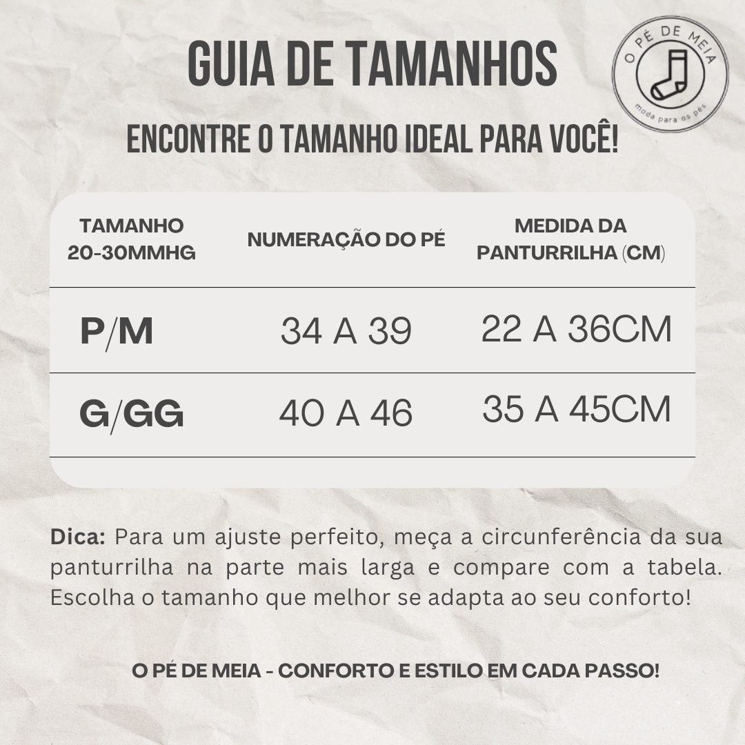 Se o seu pé for pequeno, mas sua panturrilha for mais grossa, sempre escolha o tamanho com base na medida da panturrilha para garantir o melhor ajuste!
